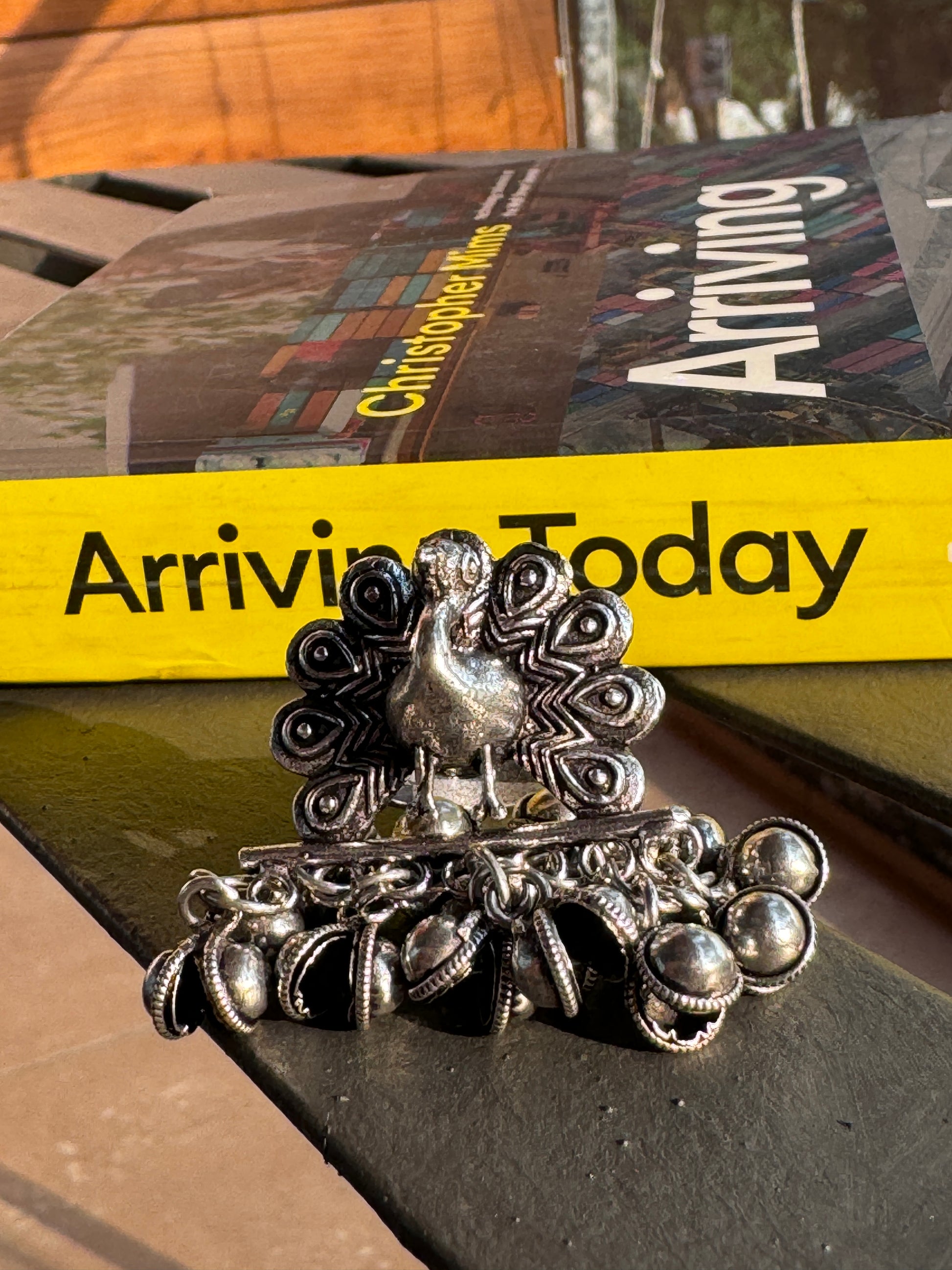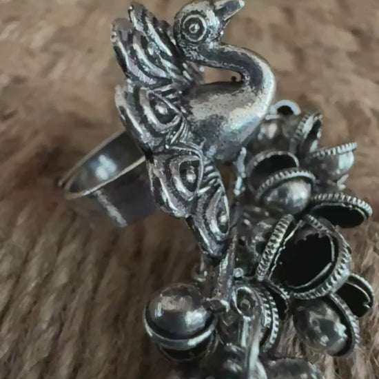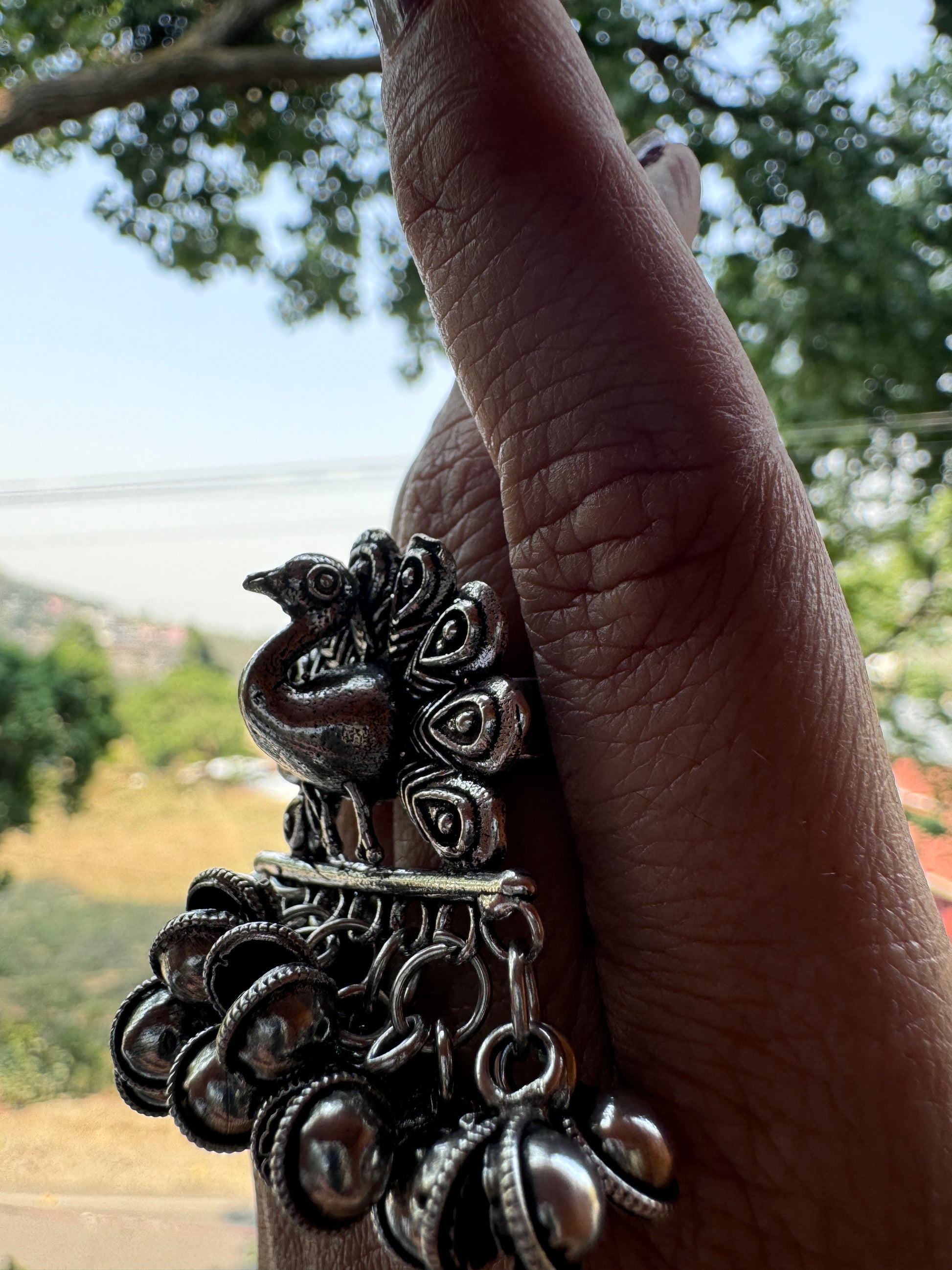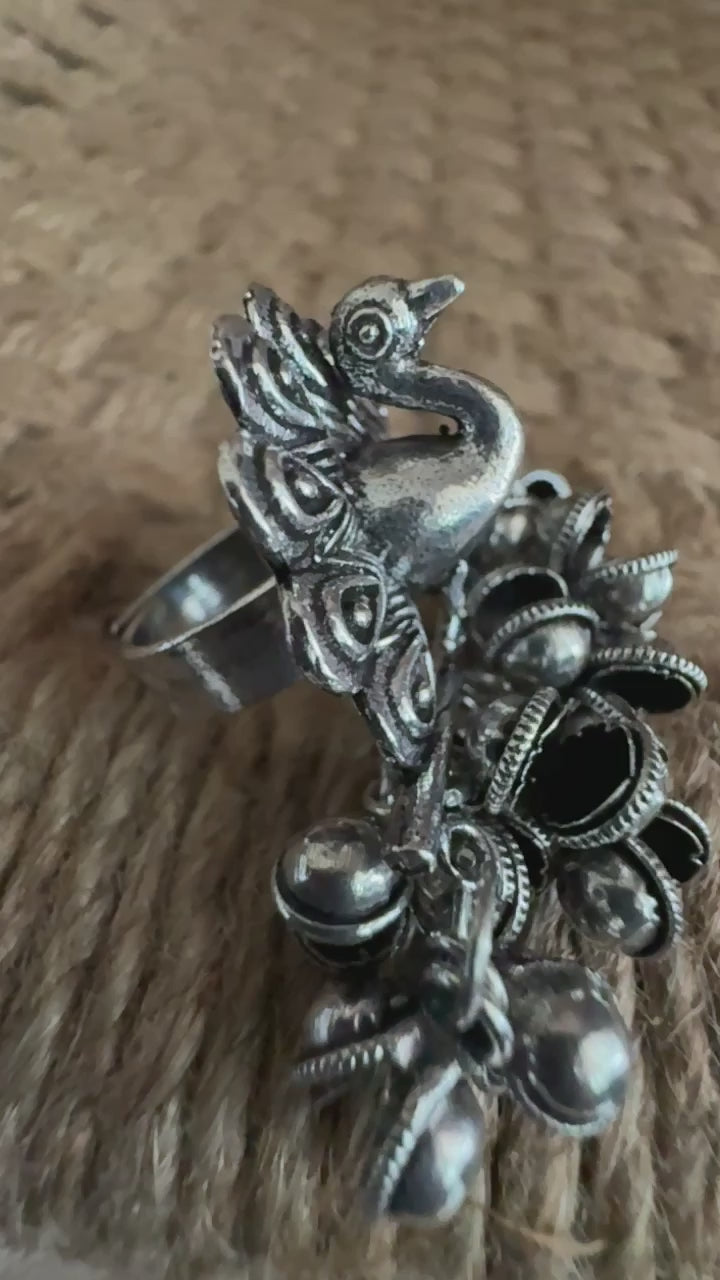 Salvanity German Silver Mayur Peacock Finger Ring with little bells